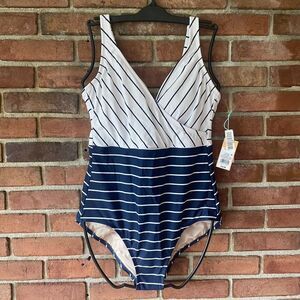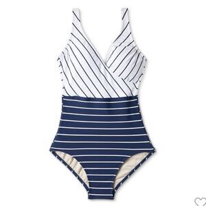 Kona Sol Striped V-Neck Full Coverage One Piece Swimsuit Navy White Large