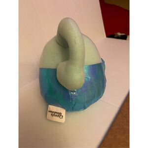 Cute little plush the bottom half is wrapped in iridescent crinkly material. There is a place where some of it has come off. Please see photos. The tag is half on and has been chewed on there is a stain on back oh head. Please see all photos .