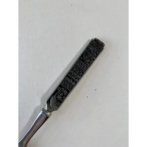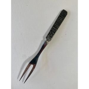This serving fork has a historical Norwegian battle scene motif on the handle! Measures 10” long and shows some minor wear from previous use.