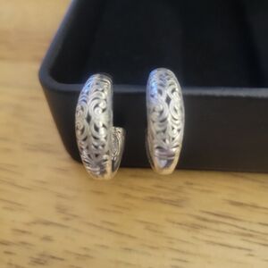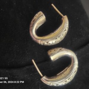 Pre-owned Konstantino sterling silver etched J hoops with 18k gold posts with sterling silver butterfly backs. Earrings are approximately 1"L x 0.8"W and weigh 11.4 grams (recently took them to a reputable jeweler to be weight). The Konstantino name is stamped on the inside of the earring.