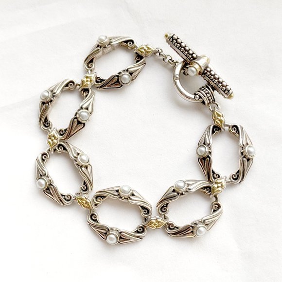 Etched silver and 18K yellow gold open link bracelet with Freshwater Pearls.