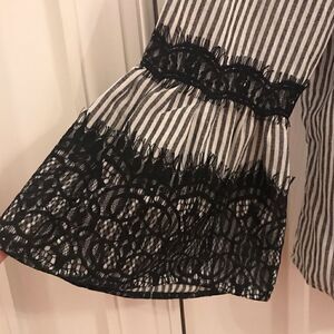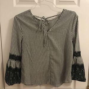 Black lacy bell sleeves on gray white striped waist length tie neck top