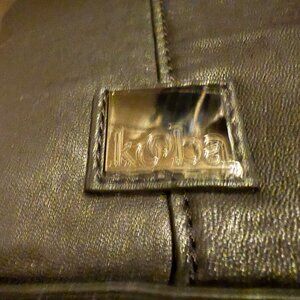 Bag is 11 inches tall with a 40 inch/20 inch drop handle. The front of the bag has a zip running down the entire length. The zip can be left open or zipped up to cinch in the bag. It also features a metal plate on the back with the brand "Kooba" on it.
