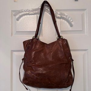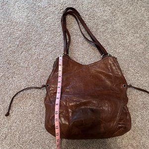 Kooba- Brown leather purse. Brass colored hardware. Soft leather. Magnetic button closure. Internal- includes 2 pouches and a zippered closure compartment. Zippered sides are functional. Timeless style.
