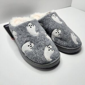 Kooba Ghost Women's Adult Size S (5-6) Faux Fur Slippers. Gray background with white ghosts.