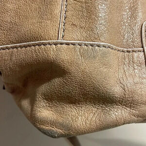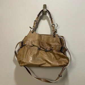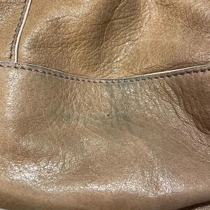Kooba Tan Woman’s cross body purse or you can hold it by the handles. The purse has some blue spots and some brown spots, please see pictures for details. It comes with a dust bag