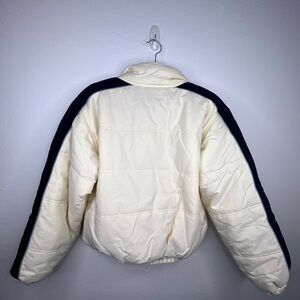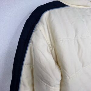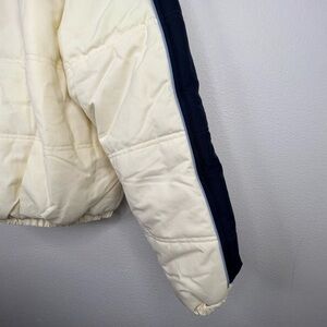 Kool! Brand Puffer Jacket / White medium weight nylon puffer jacket with high collar / Blue strip with teal piping running across shoulders and down sleeves / Full zip with buttons / Two waist pockets and one inside pocket