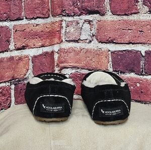 Experience ultimate comfort with Koolaburra's black and white slippers, featuring a plush interior lining and traditional moccasin stitching. These slip-on slippers are perfect for indoor wear, offering a stylish two-tone design and a warm, fuzzy feel.