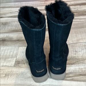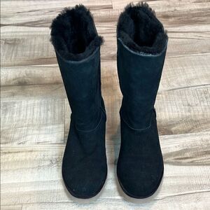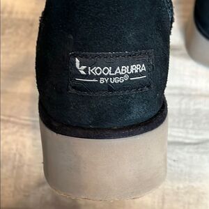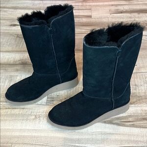 Embrace the cold with Koolaburra's black winter boots, designed for ultimate warmth and comfort. Featuring a plush fur lining and a classic pull-on style, these mid-calf boots are perfect for chilly days. The soft suede material and rubber sole ensure both style and practicality. Slight platform sole. Super cute! Gently worn a few times and has some creasing at to but very slight.