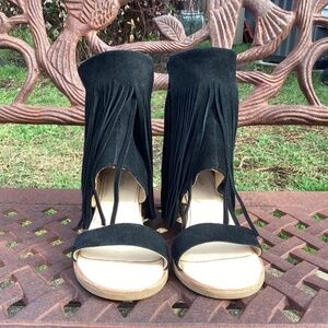 💋Koolaburra Boho Black Suede Leather Block Heel Open Toe Fringed Sandal