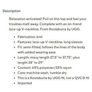 Elevate your wardrobe with this stunning Koolaburra by UGG Sand Wash French Terry Lace Up Top in size 1X. The blouse features a beautiful blue color, long sleeves, and a V-neckline with lace-up closure. It is made of a soft polyester and rayon blend fabric with terry texture, accents of lace, and features such as a slit, stretch, and pockets.