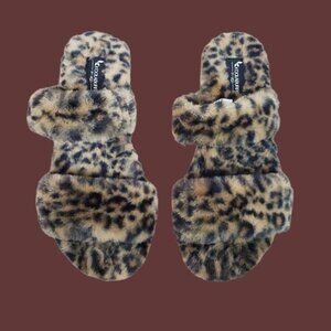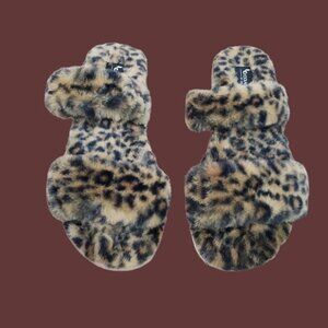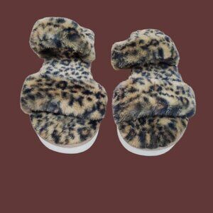 Koolaburra by Ugg leopard animal print faux fur slippers in tan and black. Slip on sandal style slippers. No stains or holes.