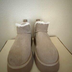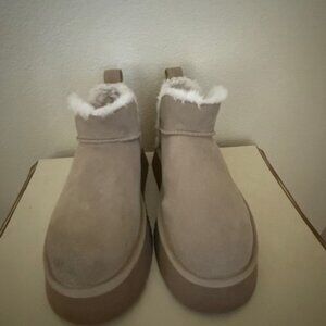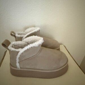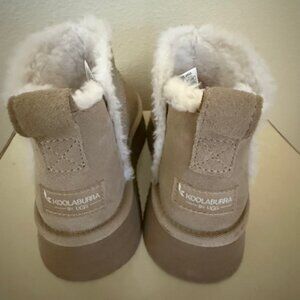 Stylish Koolaburra boots for kids. Tan suede with cozy white fur lining. Perfect for comfort and warmth.