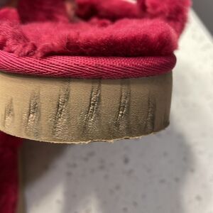 Kookaburra Ugg woman’s raspberry fuzzy sandals. These sandals on the right back of the sandals there are marks, see pictures for details.