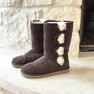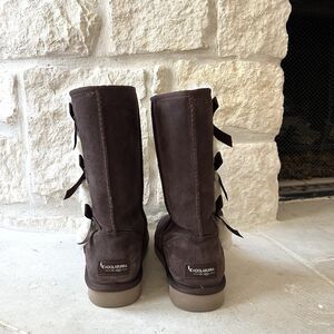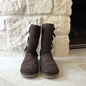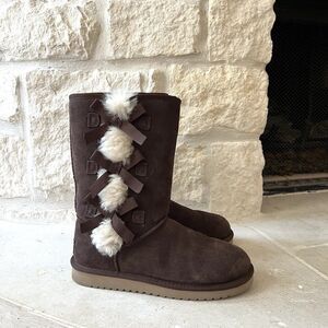 Koolaburra Victoria Tall Boot Moccasins Dark Brown Bows Faux Fur Sz 7