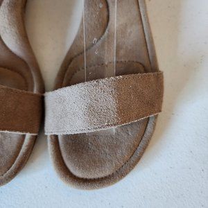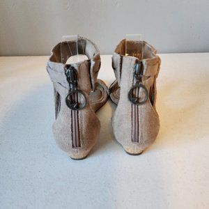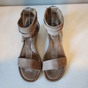 "EUC" Super Fun Tan Suede/Leather Sandal From Koolaburra By UGG. Back Zip Entry, Cushioned Memory Foam Foot Bed, Low 1.5" Cork Wrapped Wedge with Rubber Soles, Ankle Wrap With Fringe Accent, Great Condition, No Wearing on Uppers, Light Scuffing to Soles, Worn Once:) Rt.85.00 approx. Size 7.5, Foot Bed Measures 9.3/4" for Reference.
