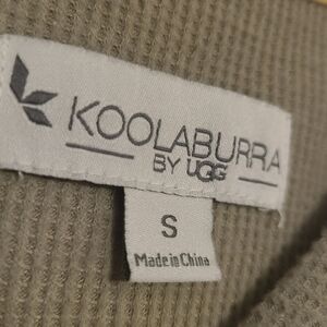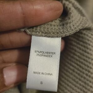 Women's tan/taupe, scoopneck, long sleeve henley top by Koolaburra, size small. Polyester and spandex fabric blend. Soft shirt has a small front pocket and is in excellent pre-owned condition; no flaws.