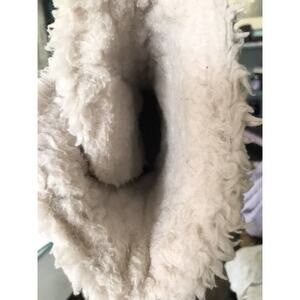 Pre-Owned - Good used condition..... Some staining (mostly around toe area) and small marks..... Faux fur is somewhat matted, but could be brushed out..... (See photos)
