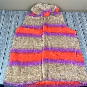 Vibrant fuzzy vest with bold stripes. Features orange, purple, and tan colors. Perfect for adding a pop of color.