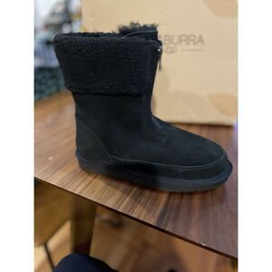 These are Koolaburra by UGG black short boots in size 4 UK (5 US, 37 EU) with a round toe shape, zip closure, and flat heel. The boots are made of textile with faux fur lining, suitable for women. The style is a snow boot named Lytta, featuring a solid pattern and medium calf width. The brand is Koolaburra by UGG, known for their comfortable and stylish footwear.