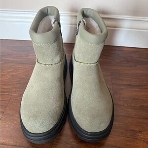 Olive green/lime wash color suede boots in a women’s size 7. These are brand new with tags attached. I do not have the original box. The upper is all suede with faux shearling lining. This is a slip on boot with a inside ankle zipper. Super warm and perfect for the upcoming winter months and weather. The brand is Koolaburra and are made by UGG . All of my items are well cared for and come from a smoke free home. The retail on these is $110.00. Considerate offers are welcomed.