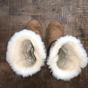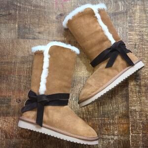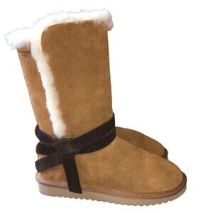 Koolaburra by UGG Rozalia Tall Boots. Womens size 8. Suede and Faux Fur. Attached tie detail. Slip on. Shaft: 11". Condition as seen in pictures. Writing on sole.