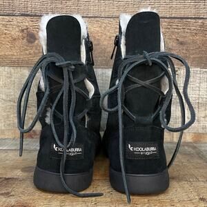 Koolaburra by UGG Shazi Short Boots. Style# 1019361. Size 7. Color ~ Black. Short, medial side zip boot. Suede upper. Decorative lace up back. Sheepskin and faux fur lining. Like new!