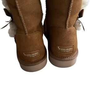 Stay warm and stylish with Koolaburra's brown winter boots, featuring a soft suede exterior and cozy fleece lining. These mid-calf boots are designed for comfort with their classic pull-on style and flat soles, making them perfect for chilly days.Flirty bows take center stage on the Victoria Tall, crafted from soft suede and lined in luxe faux fur that spills from the seams. The ultimate outfit-maker, this calf-height stunner is grounded in a cushioning sockliner and durable EVA sole equipped for all-day wearability.