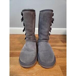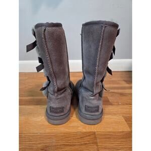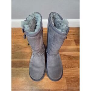 Notes: Tall gray suede boots with back ribbon bows and pom pom details. Warm shearling lining, pull-on style. Perfect cozy winter boot.