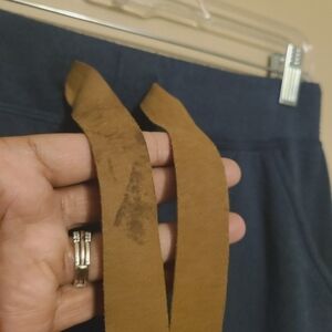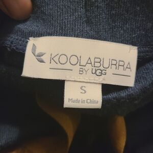 Women's comfortable and soft blue lounge or athleisure pants by Koolaburra by UGG, size small. Pull-on style pants have front slant pockets and tan/brown drawstring ties at waist. Fabric and care instructions are missing, but feels like a cotton/faux fur blend. Excellent pre-owned condition overall; some smudge marks on drawstring ties. Please see close-up pictures for more details.