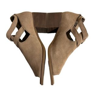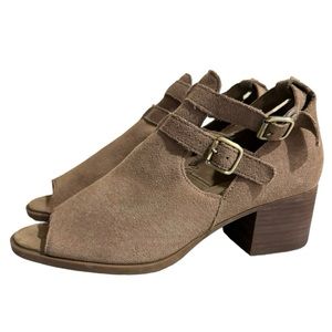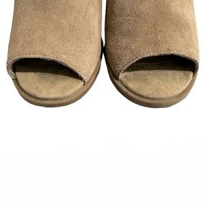 Koolaburra by Ugg Sophie Ankle Bootie Heels. Suede upper with open toe, buckle closure, padded footbed, 2” chunky heel, EVA midsole, and rubber outsole. Size 8. Very good condition. Smoke free home. Fast shipping.