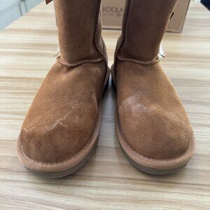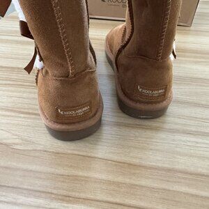 Thank you for visiting my listing! Brand: Koolaburra by Ugg Condition: Very good, worn a couple times Size: Girls 4 Victoria boots, tall style in Chestnut brown suede. Bow accents on side, faux fur lining. Will be sent in original box (doesn't have lid). *SR