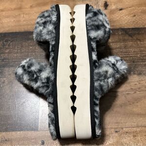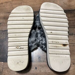 From Koolaburra by UGG. Slip-on style, faux-fur straps, inside goring on strap closest to heel. Textile upper/lining; textile/man-made sole. Faux-fur-covered top sole, foam insole, EVA outsole. Approximately 1" heel