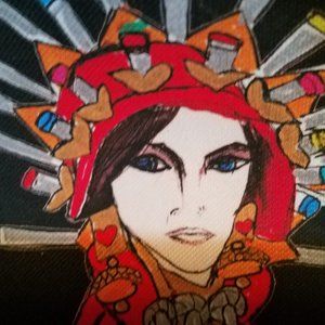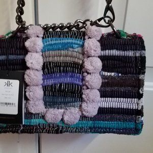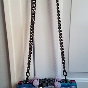 Multi-colored bag with a long, detachable gunmetal chain handle that can be adjusted to different lengths. New with tags and comes with dustbag. Measures 6" high, 10" wide, and 3 1/2" deep with 1 inner slip pocket. Magnetic closure. List price is about 400 euros, which translates to approximately $440. Has been stored in a pet-free, smoke-free home