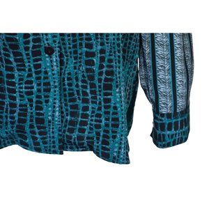 Koos of Course Top Womens Size S Wearable Art Button Up Blouse Teal Black Gray Long Sleeved