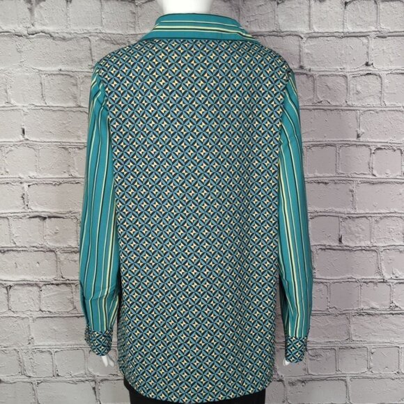 Koos of Course offers a vintage turquoise button-down shirt in a medium size for women. The shirt features a fun floral and stripes pattern and a relaxed fit. Detailed measurements can be found in the images.