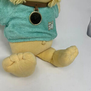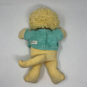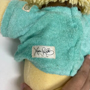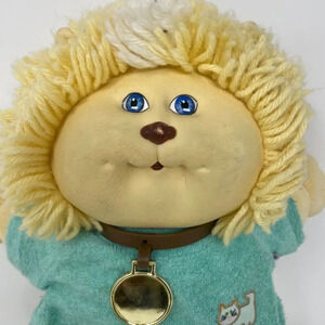 This is a vintage 1985 Cabbage Patch Kids Koosas Lion, featuring blonde yarn hair, blue eyes, and a soft plush body. Dressed in a teal outfit with a cat patch and a collar with a golden tag, this adorable lion plush is a great addition to any Cabbage Patch or Koosas collection.