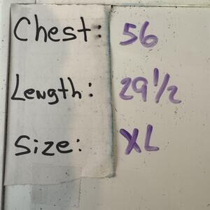 Measurements from photos (handwritten board): Chest 56 in; Length 29 1/2 in