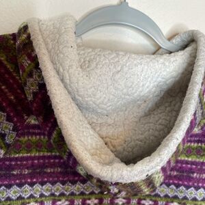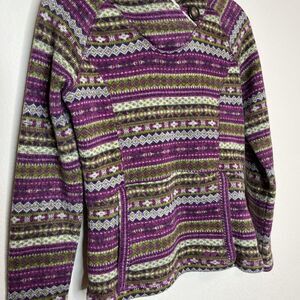 Size medium. Has the kangaroo pocket. There is some lint on the Sherpa lining but it might be able to be washed I just didn’t try! But I did take pictures of it. Besides that it is clean and has no flaws.