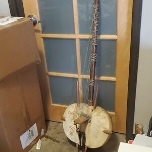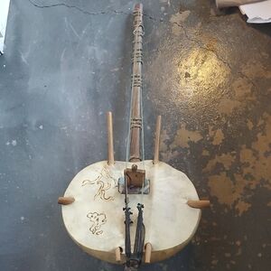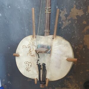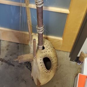 Beautiful handcrafted Kora African string instrument with a unique design. Features natural wood and cream tones.