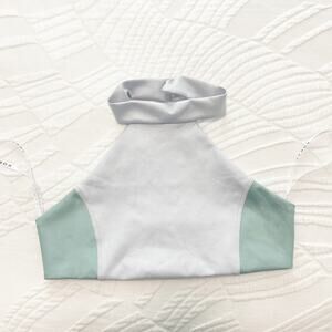 Koral Blue Choker Neck Sports Bra Size Small. Excellent condition, like new. Light blue with teal color blocking. High choker style neck with snap closure. Interior mesh lining for breathability. Low support, Great for low impact activities. Logo hardware on back.