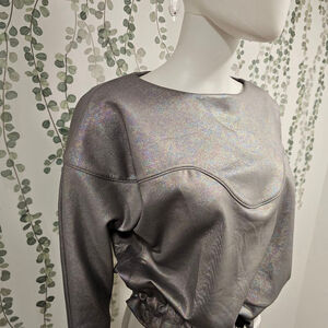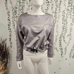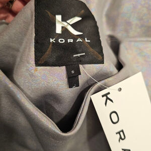 This is a Koral brand top, new with tags. The top is a size small and features a silver, iridescent material. It has long sleeves and a drawstring at the waist for an adjustable fit. The top is in new condition with no visible imperfections. The material has a slight sheen and a subtle, multi-colored shimmer.