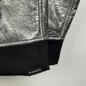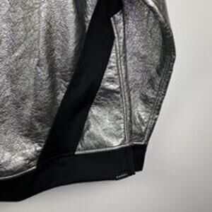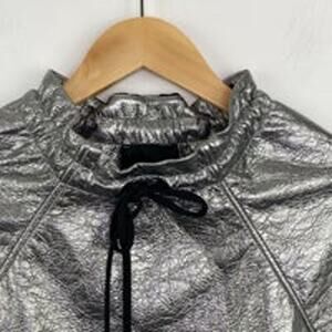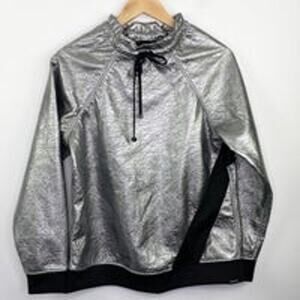 Silver black mock neck tie neck long sleeve pullover. Drawstring tie at mock neckline, metallic silver, long sleeves.