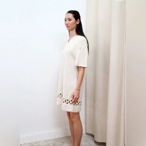 The perfect knit dress, with a twist (literally). Made of 100% alpaca with an easy silhouette in neutral colors, you will find yourself reaching for this dress all season long. The interlocking pattern just above the hem takes this dress from just an essential to a loved item for years to come. Hitting a bit above the knee, this dress can stand on its own and be styled under a cardigan as the temps get lower.