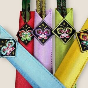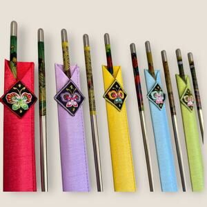 Korean Stainless Chopstick Set of 5 Pairs Painted With Embroidered Fabric Holder
