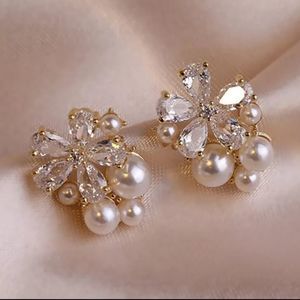 Korean Style Crystal Flower Imitation Pearl Stud Earrings For Women Girls Sweet