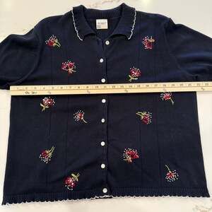 Vintage Koret navy blue short sleeve cardigan sweater, size XL. This charming knit top features delicate embroidered floral patterns in red, pink, and white. It includes a button-down front, a classic collar with white stitched detailing, and a scalloped hem. Measurements shown in photos: approximately 23 inches pit-to-pit and 23 inches in length. Perfect for a classic, cottagecore, or vintage-inspired look. Excellent pre-owned condition with no visible flaws.
