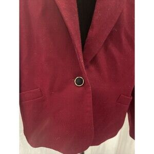 Vintage Ladies wool blazer in red by Koret. Two small holes to upper back, see photos. One button lined. Size 18. Measurements laid flat. Shoulder to shoulder 19 pit to pit 23 Shoulder to hem 25