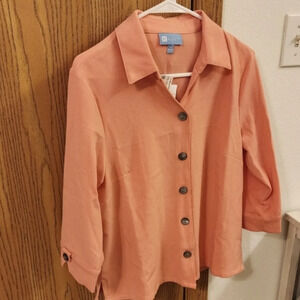Women's Koret Blouse Salmon color Collared Button Front closure 3/4 length sleeves Front sewn darts Side slits Approx. measurements: PTP 20" Length 22" New with tags, never worn.