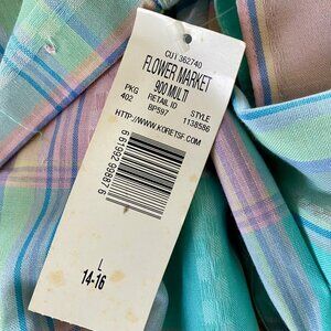 Stylish and versatile, the Koret Flower Market Top is set to become your favorite. This Women's Large 14-16 new shirt with tags features a button-down design with a classic plaid pattern. Made from 35% cotton and 65% polyester, it offers the option to roll up the sleeves.